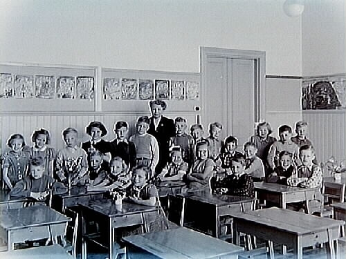 Almby Norra skola, klassrumsinteriör, 23 skolbarn med lärarinna fröken Lisa Hallin, klass 2an, sal 2.