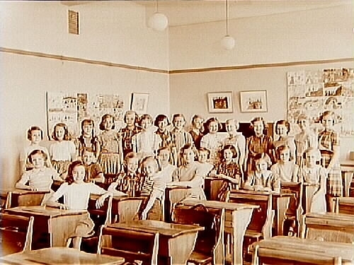 Titel: Engelbrektsskolan, klassrumsinteriör, 26 skolbarn med lärarinna fru Berta Björling, klass 4g, sal 23.