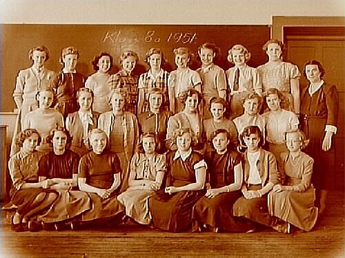 Olaus Petriskolan, klassrumsinteriör, 25 flickor med lärarinna fru Hildur Lien, klass 8a, sal 21.