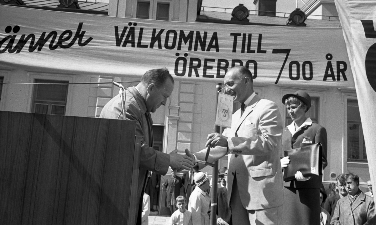 Harald Aronsson tilldelas ett standar av en herre med texten 700 år på samt det krönta Ö-et. Jubileumsvärdinna samt publik i bakgrunden.
