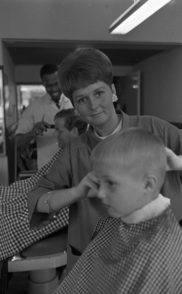I förgrunden klipper en damfrisörska håret på en liten pojke. I bakgrunden klipper en manlig frisör håret på en ung herre.