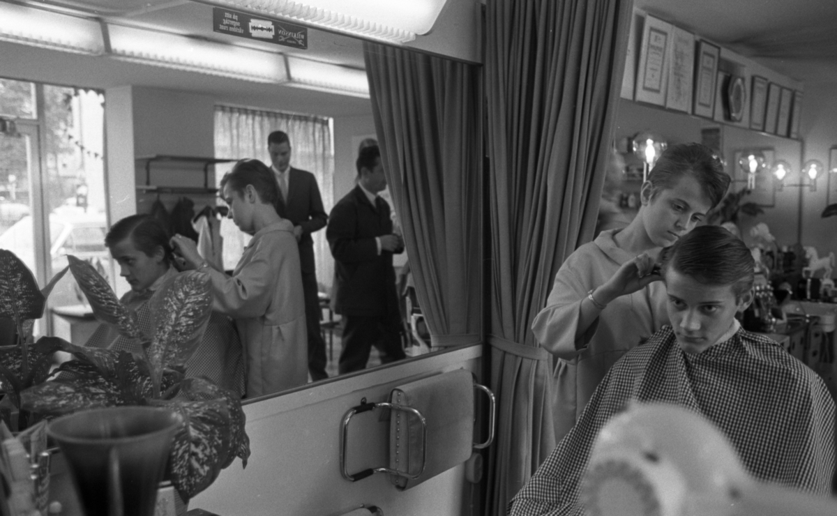 I förgrunden klipper en damfrisörska en ung pojke. I spegeln i bakgrunden reflekteras bilden. Där syns också andra människor passera salongen.