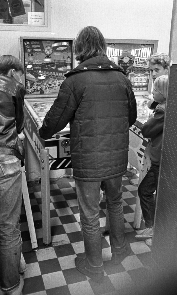 I förgrunden står en yngling vid en spelautomat i en spelhall. I bakgrunden står flera barn och ytterligare ungdomar vid flera spelautomater. På en av pelarna i lokalen skymtar en reklamskylt med texten " Apelsin Zingo försvinnande god."