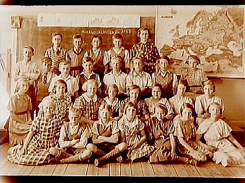 Almby skola, klassrumsinteriör, 27 skolbarn med lärarinna fröken Schöldien, klass 6c.