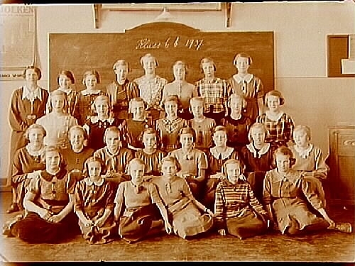 Norra Folkskolan, klassrumsinteriör, 28 flickor med lärarinna fru Olsson, klass 6b, sal 12.