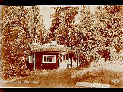 Lekstuga med skorsten och förstebro, tre flickor vid förstebron. Lekstugan vid sommarvillan.