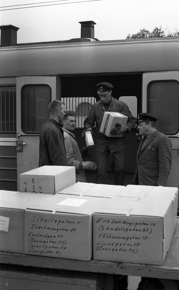 Frövi järnvägsstation. Postleverans med tåg. En järnvägstjänsteman står i ett tåg med öppen dörr och håller två paket i famnen. Nedanför står en annan järnvägstjänsteman samt ytterligare två män klädda i rockar. Framför dem står en vagn med paket.