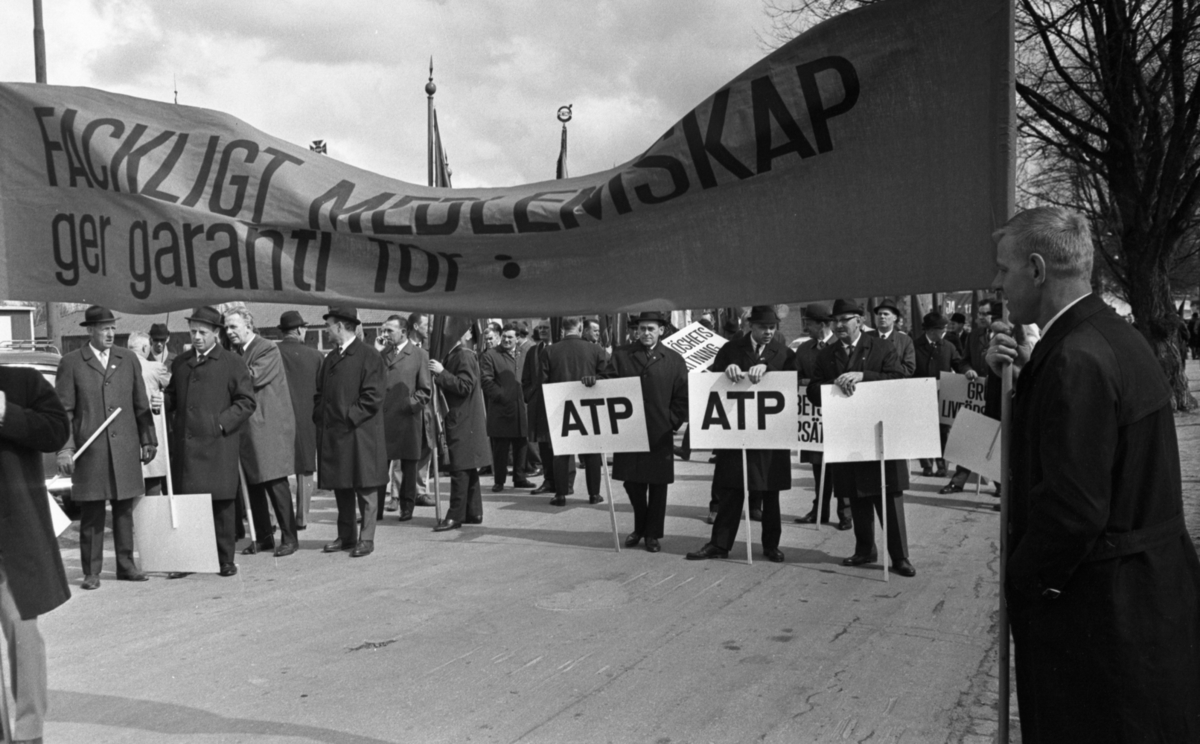 Ett stort antal män står i ett första-majtåg i centrala Örebro. De är klädda i rockar, byxor och skor. I förgrunden står en man och håller i en trästång i ena hörnet av en stor banderoll. På denna står texten: "Fackligt medlemskap ger garanti för:". Andra män i bakgrunden håller i skyltar med texten: "ATP". Fler skyltar finns även.