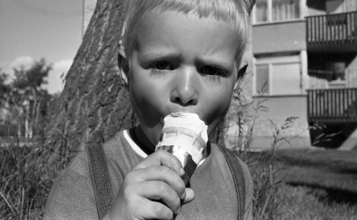 Närbild på en liten pojke i sexårsåldern som står utomhus framför ett träd och äter glass. I bakgrunden syns ett hus.