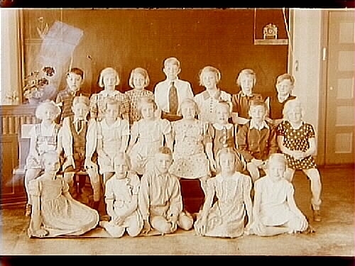 Engelbrektsskolan, klassrumsinteriör, 13 flickor och 7 pojkar med lärarinna fröken Astrid Viberg, Vikarie fru Swärd. Klass 2, sal 16.