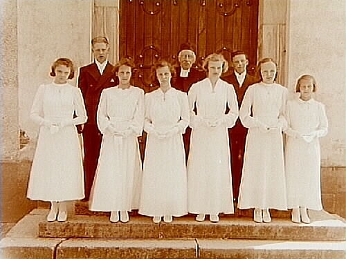 Konfirmander, 6 flickor, 2 pojkar och kyrkoherde Ivan Jäderlund framför kyrkporten.