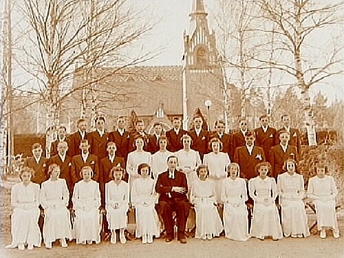 Konfirmander, 14 flickor, 18 pojkar och kyrkoherde O. Eneström.