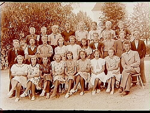 Almby Folkskola, 11 flickor och 15 pojkar med lärare Albert Johansson på skolgården.