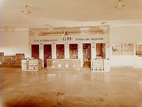 Interiör av bilutställningen, reservdelslagret.
