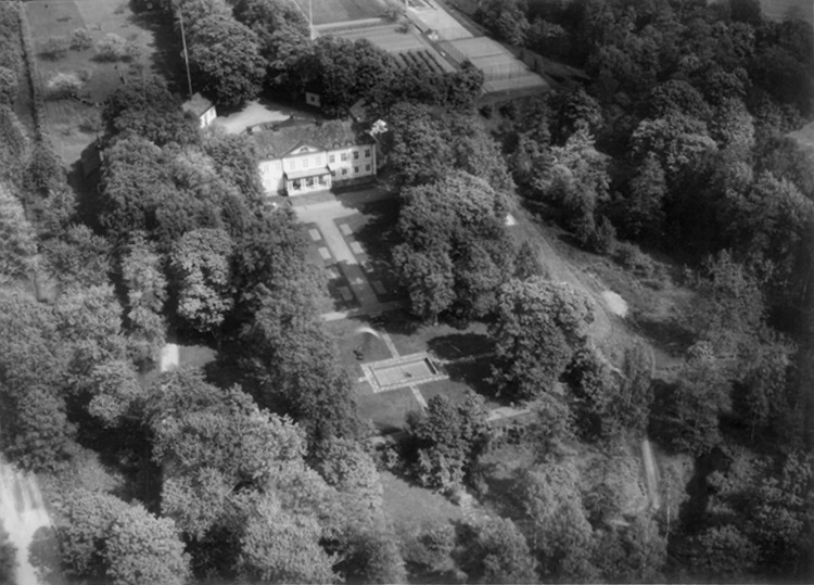 Flygfoto över Skyllbergs Herrgård, tvåvånings herrgårdsbyggnad.