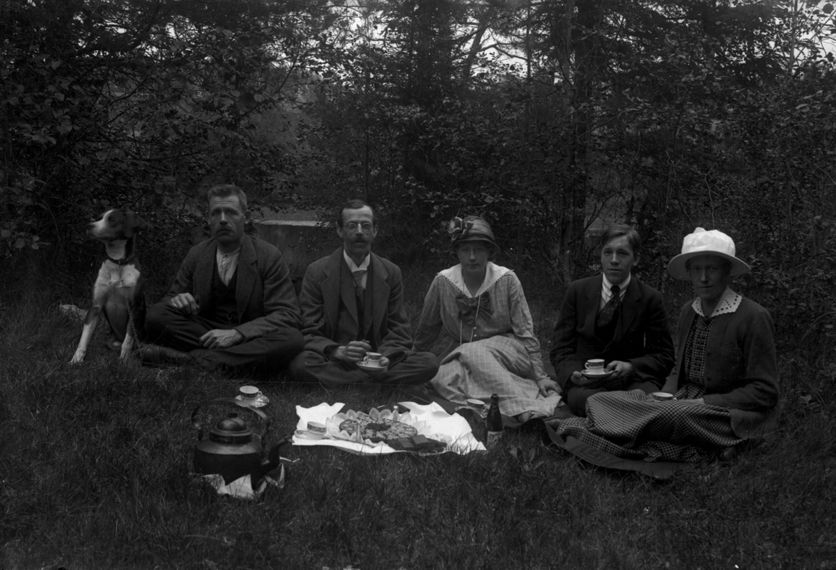 Kaffedrickande i gröngräset, fem personer och en hund.