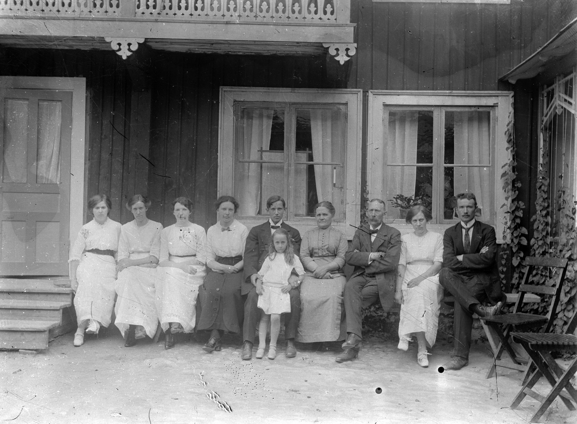 Bostadshus, släktgrupp tio personer framför huset, på gården Kungsgatan 33, Lindesberg.