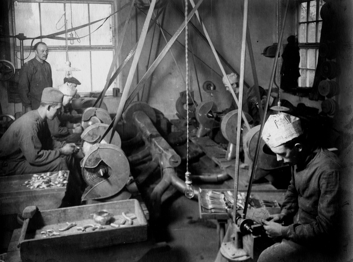 Rönnqvist & Söner, verkstadsinteriör, tillverkning av bestick, plåt- och metallartiklar, ca år 1916.
