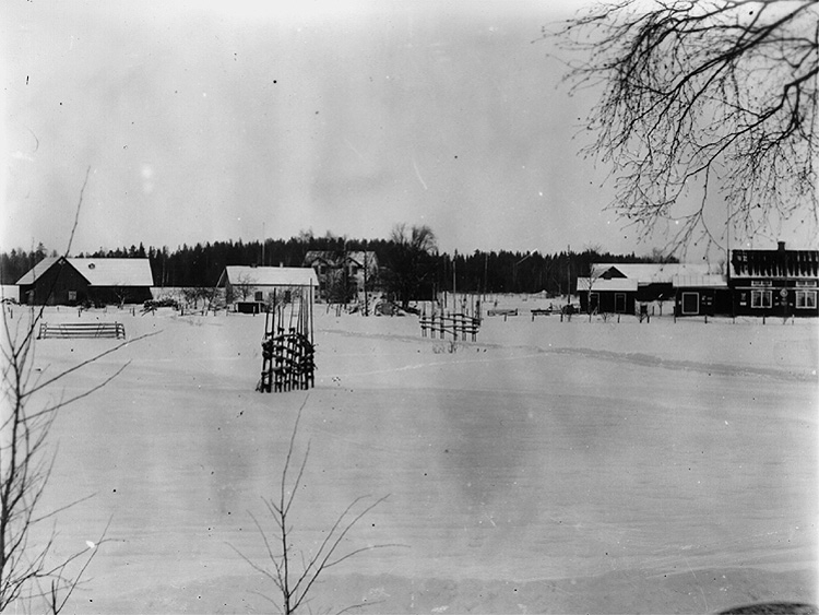 Vintermotiv, vy över "Centrum" i Stortorp, med stationen, handelsboden och Lilla Lisätter.
