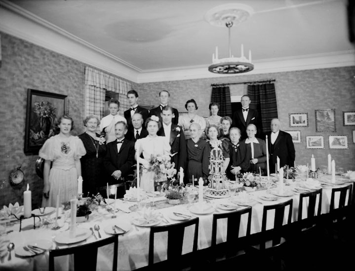 Bröllop, brudpar och bröllopsgäster. Rumsinteriör.