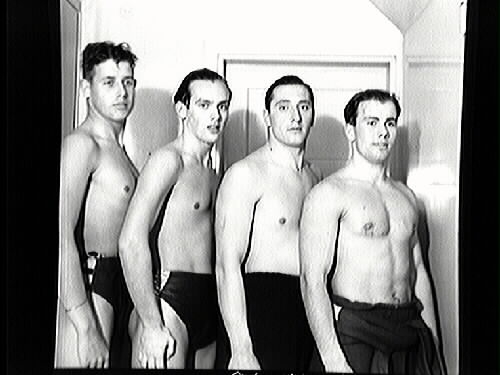 Storsimmare fr.v. Sture Svedberg, Gunnar Muhr, Tojan Larsson och Bengt Andersson. Plats:Simhallen vid Fabriksgatan.