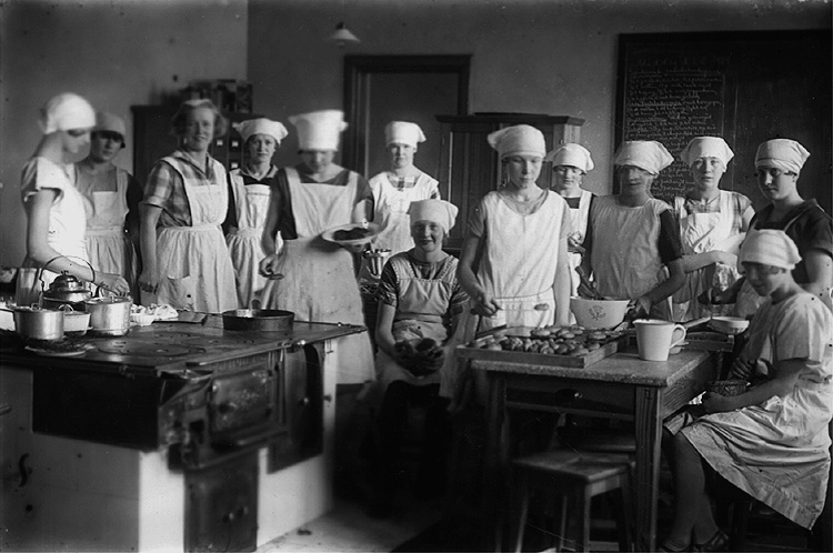 Skolkökskurs, grupp 12 flickor med lärarinna.