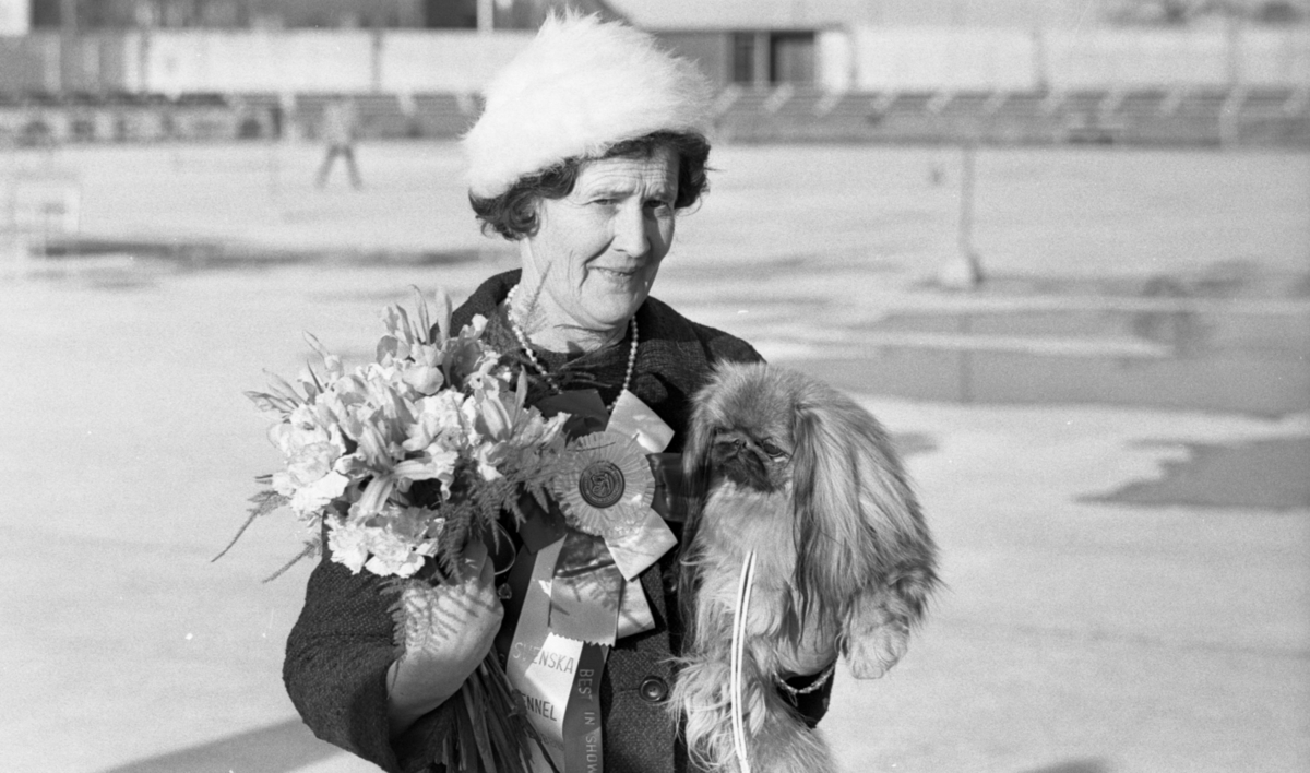 Kvinna med pekingneserhund och prissamling.