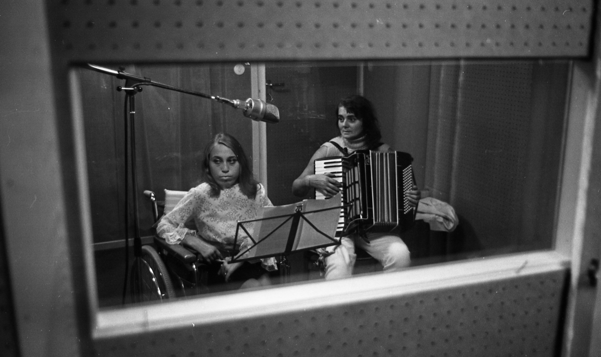 Bilden visar; två kvinnor i inspelningsstudio. Den ena kvinnan iirullstol den andra kompanjerar på dragspel.