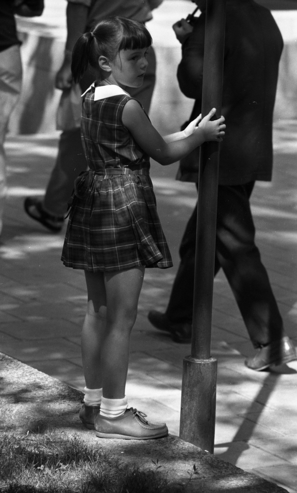 En liten flicka klädd i rutig, kort klänning, strumpor och knytskor på fötterna samt håret i pippilottor står invid en lyktstolpe och håller i denna med händerna.