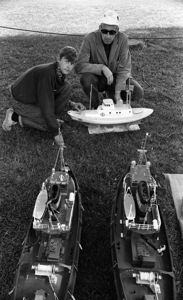 En vuxen man klädd i vit hatt, kavaj och byxor sitter på gräsmattan bredvid en tonårspojke klädd i tröja, jeans, sockor, scarf om halsen samt skor. Framför dem står tre modellbåtar.
