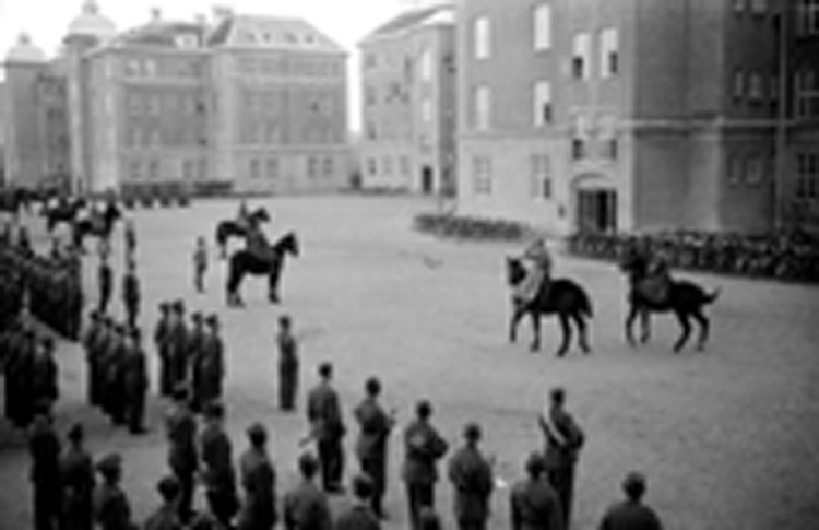 Regementstabskompaniet uppställda. Kapten Knut Arp till häst framför tredje kompaniet vid I3, Örebro.