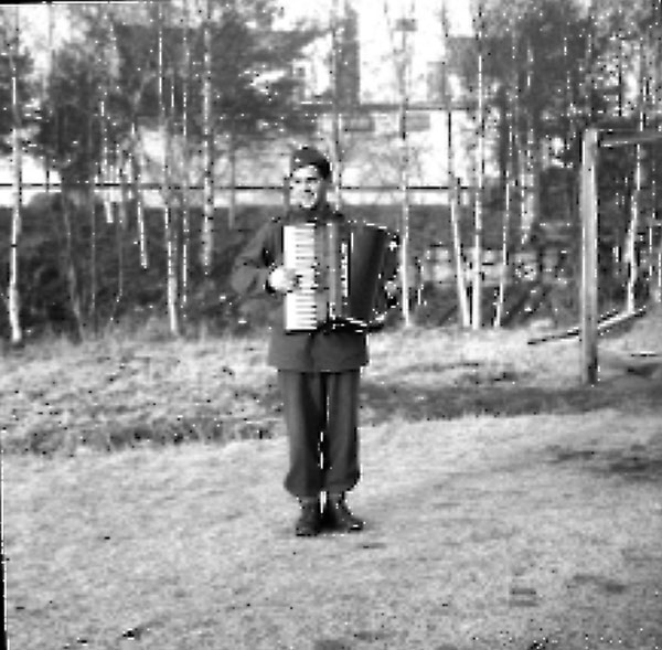 Militärövning och underhållning. En man spelar dragspel. Plats:Arrud, Ervalla.