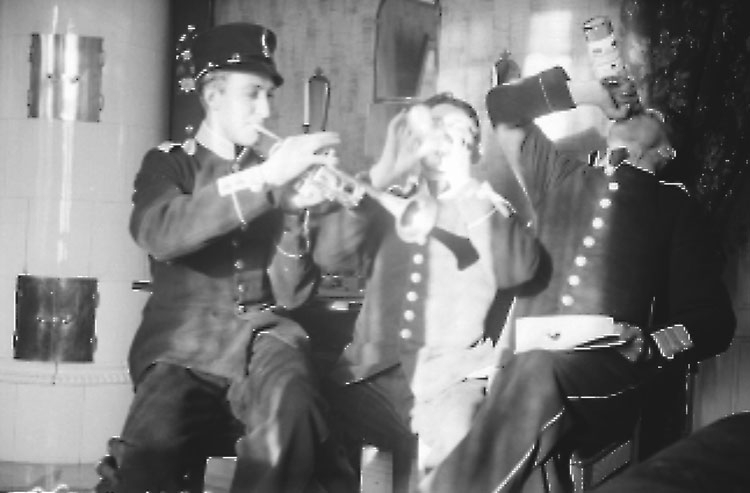 Muckfest hos Gösta Klingberg, Rudbecksgatan 5, Örebro. Strömberg, Klingberg och Wilhelmsson.
