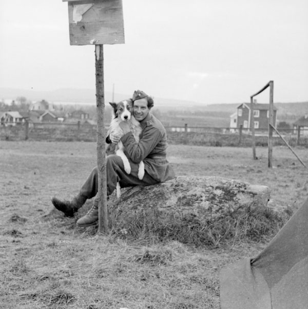 En militär med en hund står vakt i Pajala.