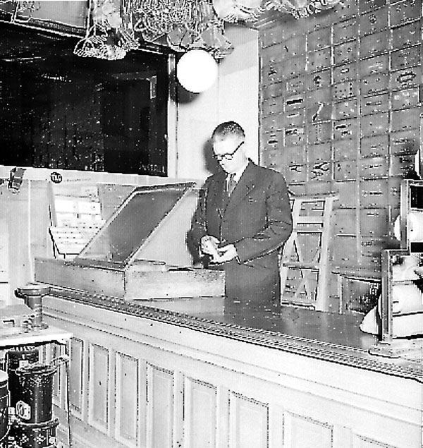 Sven Rahlén (butiksbiträde)) i arbete bakom disken. Jonssons Järnhandel.