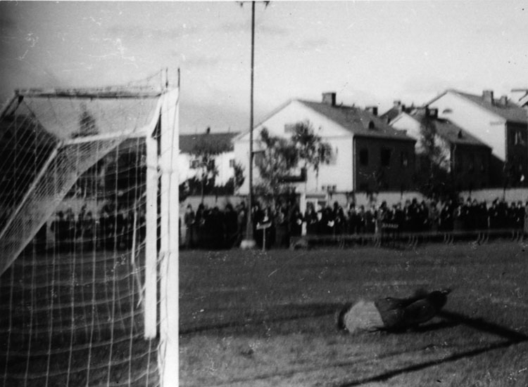 Fotboll, Eyravallen. Gösta Klingberg "räddar" ett fotbollsskott.