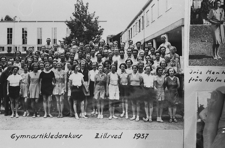 Grupporträtt med alla från gymnastikledarkurs i Littsved år 1937.