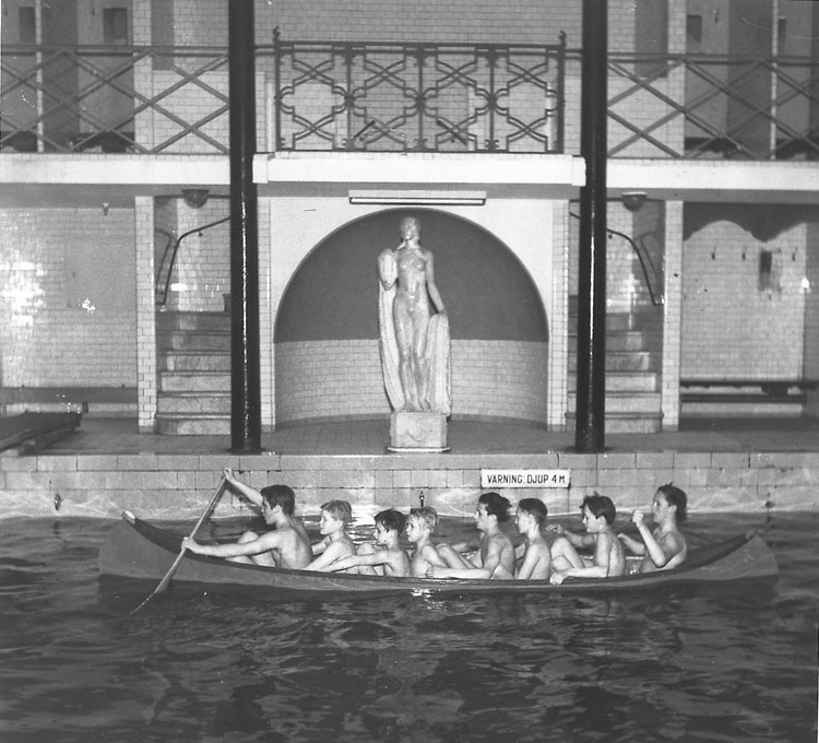 Åtta pojkar provar en kanot vid Simhallen (Badhuset), Fabriksgatan.