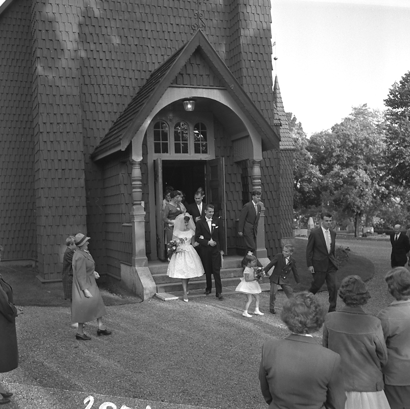 Bröllop i Ljusnarsbergs kyrka, brudpar och bröllopsgäster framför kyrkan.