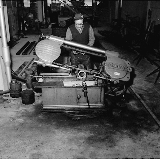 Titel: Verkstadsinteriör, en man vid järnsågen. Gustafsson & Görtz