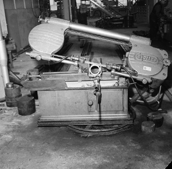 Verkstadsinteriör, järnsåg, en man.