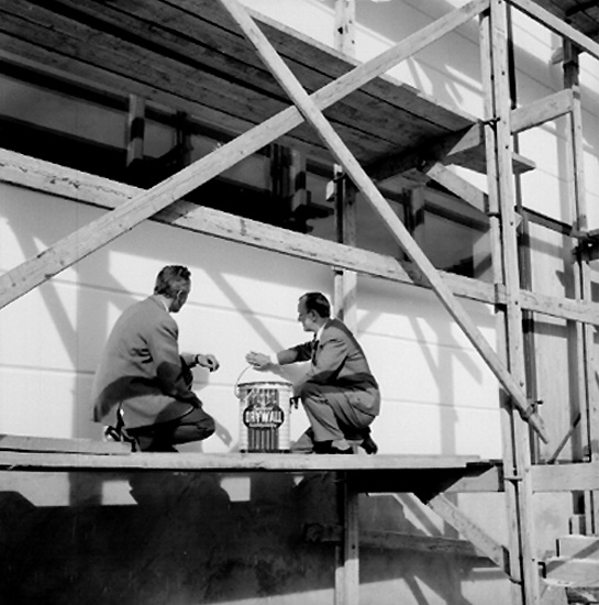 Titel: Byggnadarbete, två män. Druwall färg. Gustafsson & Görtz, byggnadsavdelningen.