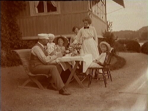 Kaffedrickande sällskap utanför hus, 23/6 1913
