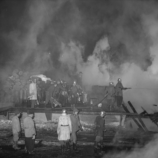 Titel: Brandsläckning, branden i pappersmagasinet i Ställdalen (februari 1956).