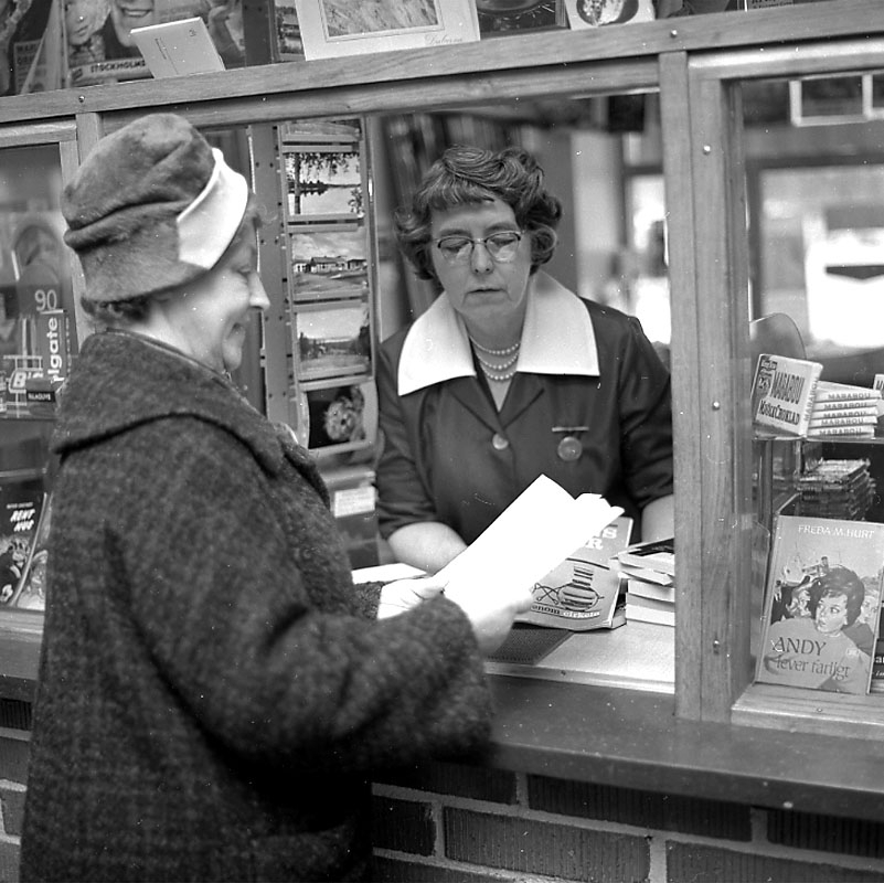 Titel: Pressbyrån i Ställdalen, två kvinnor. Fru Leonardsson med kunden fru Fjälling.