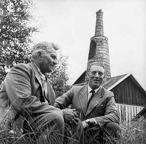 Radioinspelning i Löa, två män. Hytta i bakgrunden.
