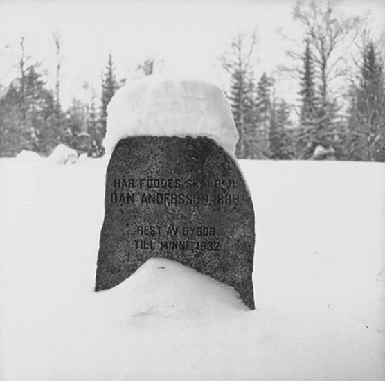 Minnessten med texten: "Här föddes skalden Dan Andersson 1888. Rest av bybor till minne 1932".
