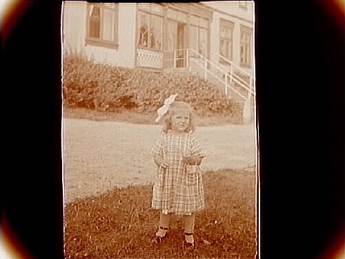 En liten flicka. Bostadshus i bakgrunden.