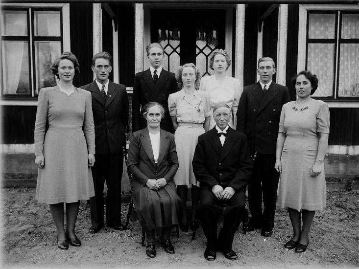 Ståendes från vänster är barnen Märta Lundqvist, Ernst Andersson, Bengt Andersson, Inga Ferm, Ruth Gustavsson, Erik Andersson och Gulli Melander. Földrarna Edla och Alfred Andersson sittandes.