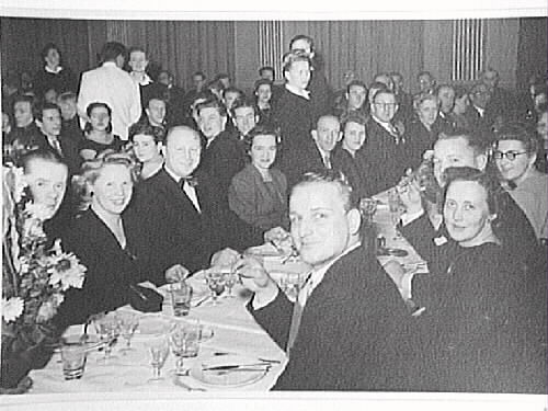 Många kända ÖSK:are. Vid närmaste bordet syns Olle Åkerberg, Becka Wijk, Bror Ståhl, Sigge Carlsson och närmast Kalle Graflund. Bakom syns Tage Magnusson, George 'Jojje' Gustavsson och Sven Bergström.